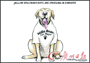 宠物狗“威利·比恩”的竞选宣传画,其衣服上写的是“威利·比恩竞选市长” (图片来源:广州日报)