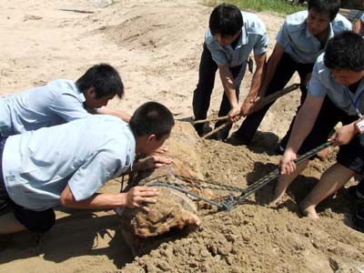 记者昨天赶到环岛路曾厝垵海边发现,边防官兵用绳索捆住两门铁炮,正从海边往岸上拉,多人拉一门火炮依然很吃力,只能拉一两米远就停下来休息一会。