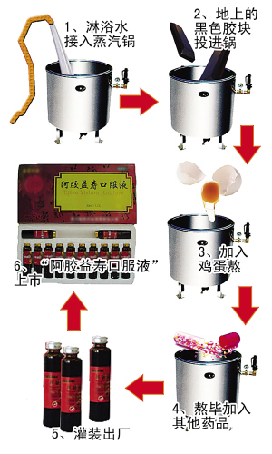 据了解,下班时间,女工们也就在这里洗澡。该公司一位领导讲,阿胶就跟以前木工用的“牛胶”差不多,因为味太难闻,所以就放在了女澡堂进行初步加工。接下来,加入其他药品进行再加工,然后就灌装出厂——产品名称叫“阿胶益寿口服液”。