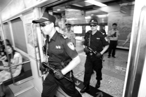 警察持微冲上轻轨巡逻