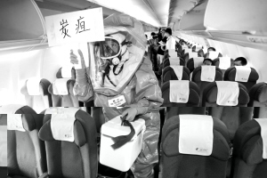 本报讯 (记者 陈旎)“生化污染,污染源是炭疽!”在江北机场停机坪的一架飞机上,两名全副武装的检验检疫专家在飞机座位下发现了两小包白色粉末。昨天上午,市检验检疫局、海关、边防等部门联合举行了我市首次生化袭击突发事件演习。