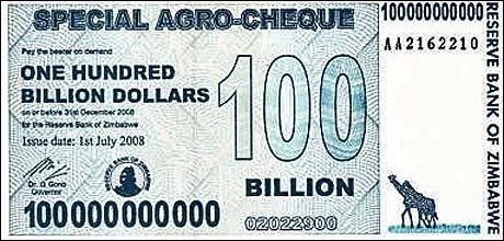国际在线专稿:由于津巴布韦国内通货膨胀率迅速提高,货币急剧贬值,津巴布韦央行被迫不断发行大面额钞票与农业无记名支票。7月21日起,津巴布韦央行发行了面额为1000亿津元的农业无记名支票。由于1000亿的支票也急剧贬值,8月1日起,津央行将100亿津元支票去掉10个“零”,价值相当于1元新农业无记名支票。由于1000亿津元的支票将不再发行,日前,这类支票开始在ebay上疯狂抢购,一张支票拍价110英镑,为实际价值的数百倍。