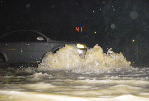 昨日晚10点多,不少市民驱车经过南京铁心桥路段时,发现路面上冒出了许多“小喷泉”。记者了解到,这一路段不但道路积水严重,而且路面因为遭到车辆的挤压破裂后地下水也冒出来。 吴非 裴睿 摄