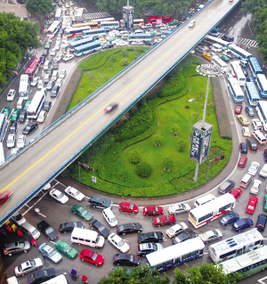 南京昨日遭受暴雨袭击,市区多处道路积水,受暴雨影响,南京市区部分路段严重堵塞,给市民出行带来不便。图为昨天傍晚,南京盐仓桥广场被车流堵得水泄不通。 王新 摄
