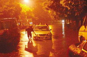 “怎么回家啊?大雨,暴雨,豪雨;积水、淹水、水好深。”今晨0点,记者来到罗廊巷,只见这里汪洋一片。有几辆出租车等在路口踌躇不前。终于,有辆的士下定了决心,一个猛子扎进了水里,但很快水越来越深,车子开出20米就水深齐门把手,于是的哥不得不慢慢倒车出来。记者看到,两个市民从西向东打算走出罗廊巷来到建邺路上,尽管他们做好了准备,脱了鞋子和袜子,卷起了裤子,但很快就狼狈不堪,因为水一直淹到了腰部。