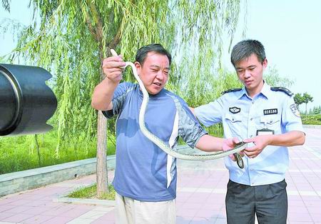 “蛇逮住了,但该咋处理,还真没这经验。”中午12时,民警为蛇的去处发愁。与野生动物保护中心联系,电话无人接听,而动物园也不接收。