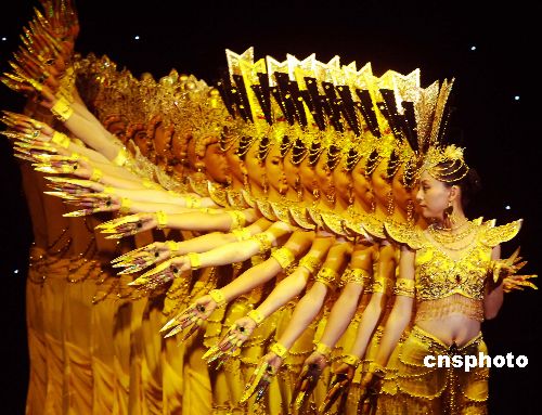 资料图:洛杉矶当地时间2007年9月30日晚,中国残疾人艺术团表演舞蹈《千手观音》,拉开第六次访美首演,赢得满堂喝彩。中新社发 贾国荣 摄