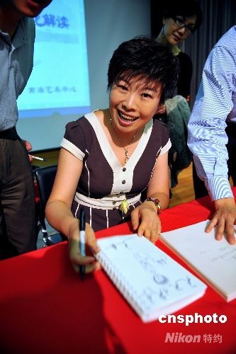 当地时间七月二十七日,北京师范大学教授于丹在美国加州的著名学府斯坦福大学举行讲座,从感性者的角度与当地华人华侨听众分享现代语境下的中国文化并现场答疑。图为于丹为旧金山湾区的华人华侨签名留念。中新社发 陈钢 摄