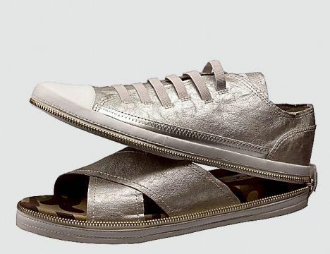 这种多变鞋被称为Nat-2,它看上去就象一双普通的匡威牌帆布鞋。但如果你想让脚透气,只需解开拉链,这时呈现在你面前的就是一双凉鞋了。帆布鞋的上部能够很容易地折叠起来,放进包里。目前有20种不同的样式可供选择,人们可以根据自身喜好选择不同的款式进行搭配。该创意很可能来自于20世纪80年代的动画片变形金刚。然而与这些到处都能买到的塑料机器人不同的是,人们很难找到出售Nat-2鞋子的商店。目前,在英国唯一取得该鞋子经营权的是位于伦敦西南部亭克汉姆(Twickenham)的 Wild Goose。每双鞋子的售价为59.99英镑。