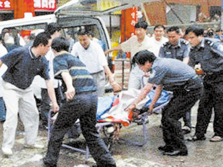 记者在现场看到,车已经撞到了门上,绿色的东风141,翻斗车,也是一种自卸卡车,载重量大概有4吨左右,车头已经撞瘪了,把宾馆的铁门也撞坏了半边。大概在当日中午12点钟左右,现场已经解除了警戒,地面上已经没有血迹,宾馆受到破坏的门是用一块印花的塑料布拉着的,宾馆迎街一面的窗子玻璃是破碎的,其他一切如常。