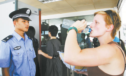 携带饮料的游客接受安检时必须自己先喝后才准带进景区。本报记者 阮班慧 实习生 庞瑞摄