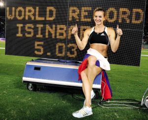 伊辛巴耶娃1982年6月3日生于俄罗斯,身高1.74米。主要成绩:2003年7月在英国国际田联大奖赛上以4米82打破室外撑杆跳世界纪录;2004年3月在布达佩斯举行的世界室内田径锦标赛上,再次以4米86的成绩成为该项目世界纪录保持者。此外,她还保持着4米47的青少年室外世界纪录,是目前独一无二的女子撑杆跳项目中三项世界纪录保持者。2004年雅典奥运会上以4米91的成绩再次刷新女子撑杆跳世界纪录,并将金牌收入囊中;2005年7月在伦敦举行的国际田联超级大奖赛中,跳过5米横杆,成为历史上第一个飞越5米大关的女子撑杆跳高运动员,这也是她第17次刷新世界纪录;2008年7月12日,在黄金联赛罗马站的比赛中,她再度打破自己保持的室外赛撑杆跳世界纪录,成绩为5.03米;2008年7月30日的世界田联黄金联赛摩纳哥站赛上,她以5.04米第23次刷新世界纪录。