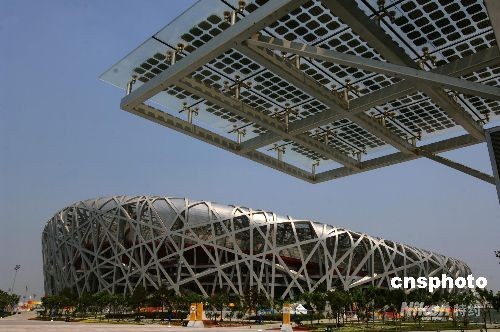 8月3日,北京晴朗天空中,国家体育场鸟巢和一座小型太阳能电站。中新社发 邹宪 摄