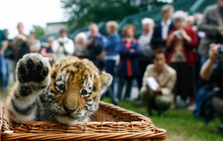 8月4日,在德国首都柏林的腓特烈斯费尔德公园,六周大的东北虎幼崽“安塔尔”与游人见面。东北虎在一些国家被称为西伯利亚虎或阿穆尔虎,为现存最大的猫科动物,成年虎体长约2.8米,主要分布在中国东北地区和俄罗斯西伯利亚地区。