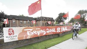 在中餐馆名门金宴酒楼的院外也于近期挂起了北京奥运的巨幅横幅,并插起了加拿大和中国国旗。据该酒楼高经理介绍,奥运横幅是专门订做的,挂在车水马龙的史刁士大道边,可以让更多人知道本届奥运会是在中国北京举办。
