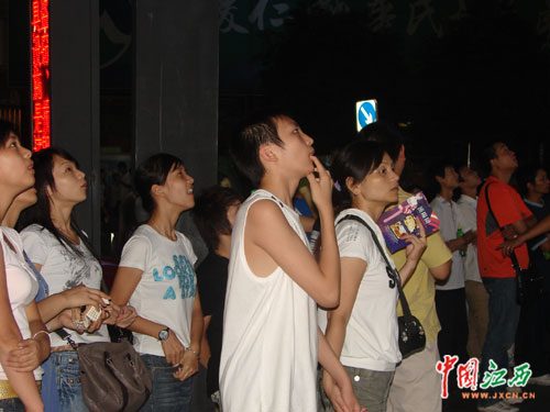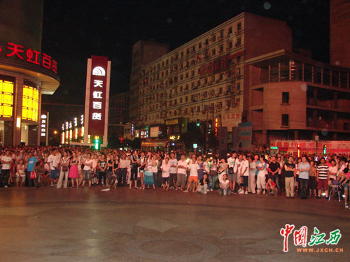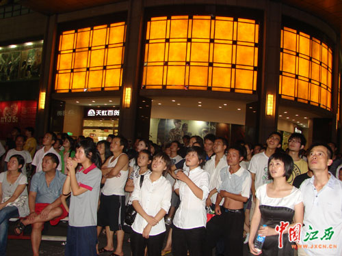 8月8日晚,千余市民齐聚南昌最大户外LED显示器前,共赏开幕盛事。 (江西网见习记者 邱辉强 摄)