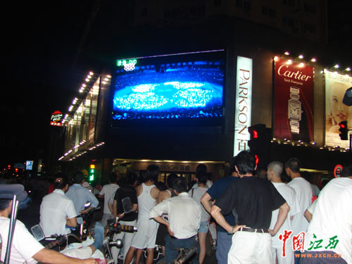 晚上8点还没有到,百盛商场门口便开始人头攒动,大量市民从四面赶来,纷纷在百盛商场门口驻足,静候激动人心时刻的的到来。市民黄先生告诉记者,他7点还没有到,就已经在这里占据有利位置了。他说,虽然家里有彩电和空调,但他还是选择来到这里观看,因为这里气氛热烈,和大家一起观看,一起鼓劲呐喊,比一个人独赏爽多了。