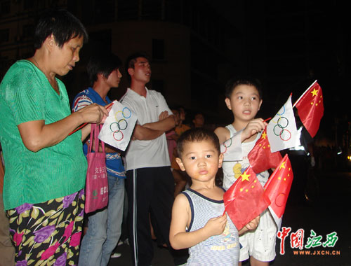 这两个小孩边看,边摇旗为奥运加油。(江西网见习记者 邱辉强 摄)