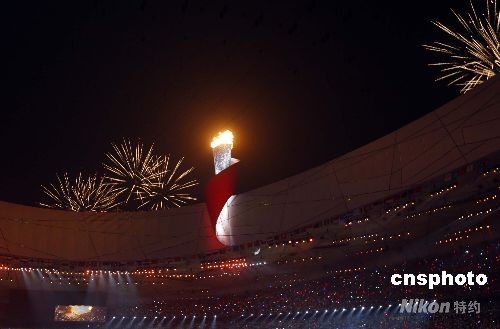 8月8日,第29届夏季奥运会在北京奥林匹克公园内的国家体育场“鸟巢”举行。李宁点燃北京奥运会主火炬,奥运圣火在鸟巢上空熊熊燃烧。中新社发 杜洋 摄