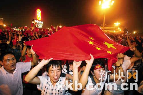 无数的中国人汇集在这里,脸上贴着爱心图,头上插着小红旗,不时敲打着气棒呐喊。一些外国游客头戴“马聚源”、身穿“瑞衭祥”、脚踏“内联升”,掀起一片中国风。