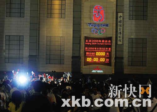 8月8日晚上8时,北京,天安门广场东侧奥运倒计时牌上,“几时几分几秒”的数字最终变成了“00时00分00秒”,近万人在现场守候,齐声倒数,迎接北京奥运会的开幕。