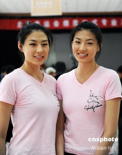 7月26日下午,337名奥运颁奖礼仪志愿者在北京进行结业汇报演出。27日,她们将全部入驻奥运比赛场馆。图为双胞胎姐妹花崔雅娟、崔雅婕。中新社发 王东明 摄