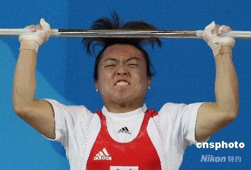 8月9日上午,北京奥运会举重第一项赛事--女子举重48公斤级决赛在北京航空航天大学体育馆举行,一名选手在奋力推举沉重的杠铃时秀发冲天而起。中新社发 任晨鸣 摄