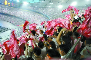 坐在我旁边的,是来自世界上不同国家和地区的奥林匹克青少年夏令营的小朋友们,他们的表现更为激动,不时地挥舞着鲜艳的五星红旗。
