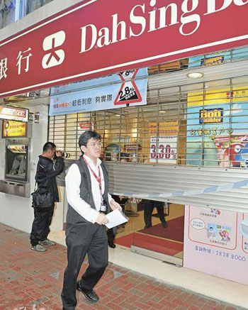 遇劫的大新银行与曾经发生虚报劫案的地点,仅相隔一条马路,银行事后关闸等候探员到场调查。(图片来源:明报)