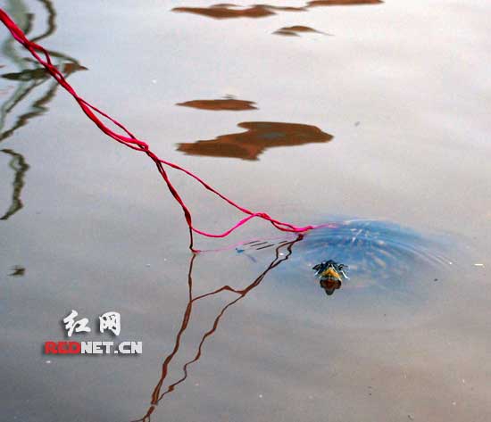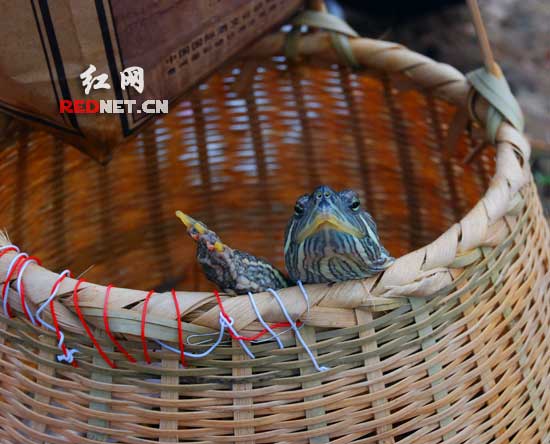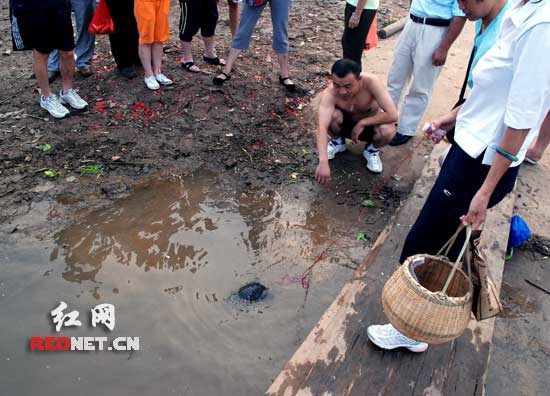 (只要谭女士把篮子放到湘江边,这只乌龟就想往外爬)
