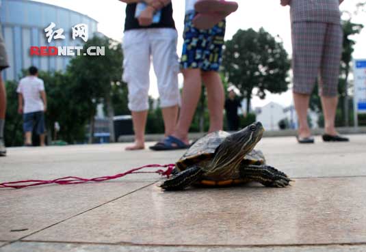 红网长沙8月13日讯(实习记者 章尧)见过遛狗遛猫,您见过遛龟吗?长沙的谭女士养了一只龟龄超过十年的乌龟,每天清晨谭女士都会带上这只心爱的宠物出来遛一遛,引得一大群市民围观。
