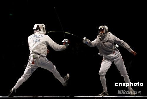 8月12日晚,08北京奥运会男子佩剑个人赛决赛在北京国际会议中心击剑馆揭开战幕,赛会黑马14号种子中国选手仲满(右)和法国选手洛佩兹在决赛中遭遇,结果中国选手仲满以15-9战胜对手获得冠军,这是中国男子击剑在奥运会上第一次获得冠军。图为仲满在比赛中。中新社发 盛佳鹏 摄