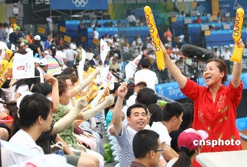8月13日,2008北京奥运棒球赛在五棵松体育中心举行,北京球迷拿着加油棒大声喊“中华台北加油”。中新社发 CNAsports 摄