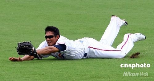 8月13日,2008北京奥运棒球赛在五棵松体育中心举行中华台北队对荷兰队之战,中华台北队林哲瑄一个漂亮的接杀,整个人扑倒在地上。中新社发 CNAsports 摄