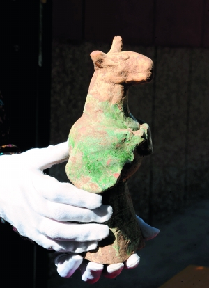 据武威市文物考古研究所所长张振华介绍,11日傍晚接到群众举报称,凉州区夏润小区内一处建筑工地上,有关人员在住宅楼地基施工时发现古墓。考古人员随后进入现场勘查,并于12日早间开始抢救性发掘,共在前室中发现陶马、陶牛、陶车、陶制楼院、陶灶、陶仓、陶井、陶熏炉等陶器40多件,全部都是绿釉陶,初步判断属于东汉晚期。
