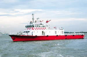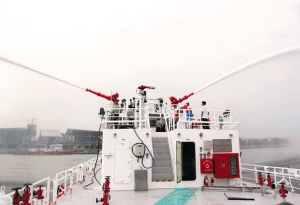 记者认真地数了下,船上主要间隔包括空舱、消防器材间、值班室、医疗室、备勤室、驾驶室、卫生洗消间等在内的七大类主要舱室。如此科学的空间设置极大提高了“珠江号”的作战性能,同时船艏设置侧推。船上设置了可同时出水的4门消防炮,在一旁参与设计施工的张一民工程师表示,在4门消防炮出水灭火同时,该船可保持船舶定位,具有良好的视野和回转性能。