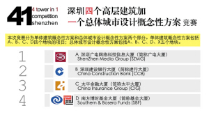 参与竞赛的四个单体高层建筑位于深南大道北侧,都在深交所的周围,是一个高标准的建筑群,包括:深圳广电网络科技信息大厦、深圳建设银行、太平金融大厦和南方博时基金大厦。总体城市设计则包括上述四个高层建筑以及招商银行大厦在内的城市空间(招商银行不参加这次竞赛)。因此竞赛的名称叫做“41”,“41”既有四个竞赛合一的意思,也有四个(单体)竞赛加一个(总体)竞赛的意思。