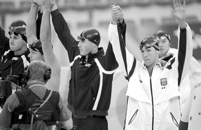 鲍勃的行李箱里,到哪儿都带着菲尔普斯15岁那年入选美国奥运代表队时他们俩的合影。师徒俩都笑得很好,“情绪不好的时候,我就会拿出来,看看它。”而当上周菲尔普斯赢得北京奥运会首枚金牌,想到去年此时他意外手腕骨折,禁不住在领奖台上激动落泪。而几乎同时,泪水也涌上了鲍勃的眼眶。