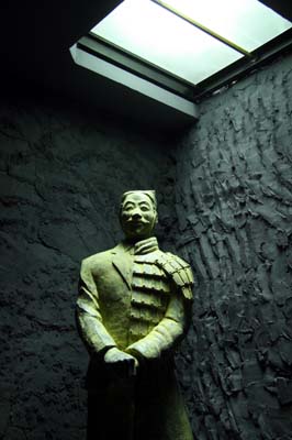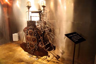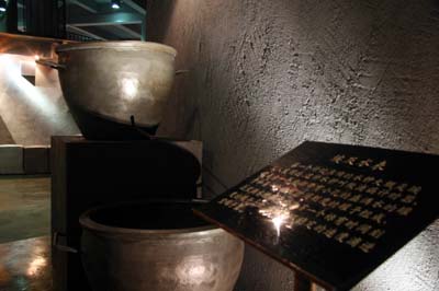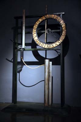 除了古今中外的计时器,馆内还有不少具有象征性的物件。其中一具秦兵马俑雕塑格外有趣,它身上着装一边是古代铠甲,另一边则是现代西装,双手握着的“利剑”的一半是现代拐杖。此外,一个看似人们常用的巨大闹钟,两个响铃竟然是用铁锅制成的,中间用来敲打铃声的则是一把日常工作中的铁锤。