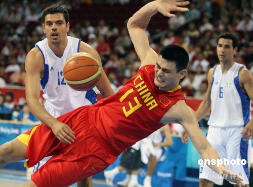 北京奥运会男子篮球小组赛第五轮比赛8月18日在五棵松篮球馆举行,由姚明统率的中国队与世界劲旅希腊队为八强位置展开激战,最终,实力不足的中国队以77比91告负;虽然姚明砍下全队最高的16分,但对全局无济于事。中新社发 任晨鸣 摄