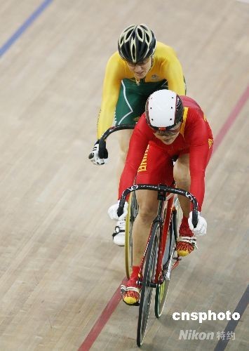 8月19日,2008北京奥运会场地自行车女子争先赛半决赛在老山自行车馆进行,中国自行车“希望之星”郭爽因第三战决胜战因为与对手米亚雷斯有身体接触犯规被处罚取消成绩,因此遭逆转惜败无缘决赛,只能与荷兰选手卡尼斯争夺铜牌。中新社发 武仲林 摄