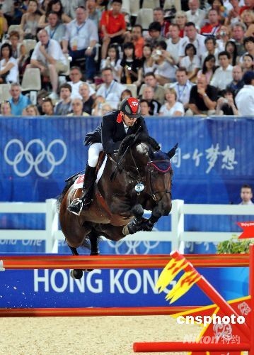 八月十八日晚,奥运马术场地障碍赛团体赛决赛(第二轮)及个人赛(第三轮资格赛)在香港沙田赛场举行,图为唯一进入个人赛(第三轮资格赛)的中国香港选手林立信策骑“城市”单骑应战,但马匹表现逊色。中新社发 邓庆乐 摄