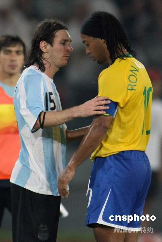 图:阿根廷淘汰巴西 梅西安慰小罗 中国新闻网 中国新闻网官方账号 2008.08.2000:10 关注 8月19日晚,北京奥运会男足第二场半决赛在北京工人体育场举行,由球星梅西领衔的阿根廷队以3比0淘汰巴西队进入决赛。赛后,梅西与巴西队队长罗纳尔迪尼奥拥抱并安慰这位好友。 中新社发 任晨鸣 摄