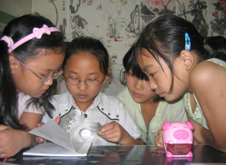 在哈利英语角教书的黄老师是位特殊的家长。他的女儿Sunny9岁,学习、住宿都在袁鸿林家。黄老师自我介绍说,他学的是建筑工程,在民办学校教过书,也从事过房地产业。今年7月开始在这里教数学,“主要是陪读,照顾女儿。有她妈妈一个人工作就够了,以前也有点积蓄,生活没问题,等以后孩子大了我再出去工作。我希望女儿首先是快乐,然后才是怎么为社会做贡献的问题。”