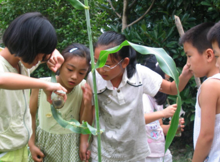 小区里的一片绿地也是孩子们的乐园。他们在这里种了一株高粱。这几天他们正忙:都在小区里拾烟头,把里面的过滤嘴剥出来,放在杯子里,放上水制成“尼古丁杀虫剂”,再浇到高粱上。“这个方法是Daddy教我的。”袁小逸说。“蜘蛛!”孩子们在草地上发现一只大蜘蛛,没有人躲闪或惊叫,反而有人冒出一句:“快抓住它,弄回去做标本。”