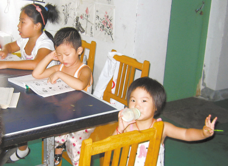 两岁的小女孩小瑜在一个笔筒里随意地挑着笔,笔筒里的扑克牌早被她扔到了课桌下。瑜妈妈连忙拿起奶瓶递给她,她索性从椅子上爬下来,咬着奶嘴大口地吸了起来……