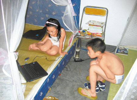 晚上8点半上完课,孩子们自己洗澡,9点左右,就开始准备睡觉。袁鸿林家有三间房,客厅是主教室,一间房是小教室,另一间房则是卧室,里面有两张床。袁鸿林夫妇睡一张,女儿和同学睡一张,有时也打地铺。在离家很近的一个小区里,袁鸿林还租了一套房子。他的岳父母和黄老师分别带着孩子们住。我看到这套房的卧室里都有空调,床上有蚊帐,一间房里有电视,彭也珂和同学正在看奥运会,另一间房里,孩子正通过黄老师的笔记本电脑收看比赛。“小一点的孩子通常9点左右就睡了,大一点的会到10点过。一般我们不让孩子看电视,但这段时间有奥运会就破了例。”袁鸿林说。