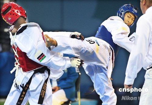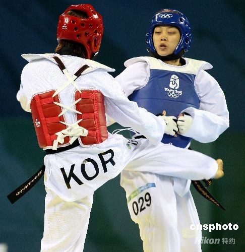 8月21日,在北京奥运跆拳道女子57公斤级预赛中,中华台北选手苏丽文(右)对阵韩国林秀贞,苏丽文惜败对手无缘晋级。中新社发 CNAsports 摄