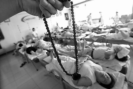 昨日上午,工商执法人员前往查处。治疗室是一间约200平方米的大房间,房间内一端摆放有十来张按摩床,床上躺满了老人,而房间的另一端,在一名工作人员的带领下,几十位老人坐在凳子上围成一圈,正在做手操。一些老人脖子上戴着“黑项链”。