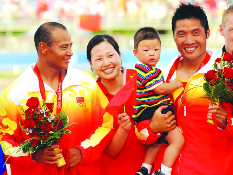红地毯上的最高领奖台上,当孟关良和杨文军在镁光灯前露出胜利笑脸时,突然出现的一位小客人引起了在场所有人的欢呼。孟关良15个月大的儿子被抱上了领奖台。当站在台上的孟关良从妻子手中接过儿子后,脸上灿烂的笑容不仅仅来自于胸前挂着的金牌。而一家三口和自己亲密“战友”面对国旗的合影,成为北京奥运会皮划艇收官之日的一幕经典。